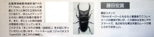 審査員であるむし社代表取締役社長の藤田さんのコメント。個人としてはちょっと微妙(笑)西日本の佐賀県の個体なんですが!!もう一頭、韮崎産も応募していたのですが、そちらの個体につけてほしいコメントですな。