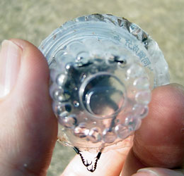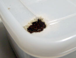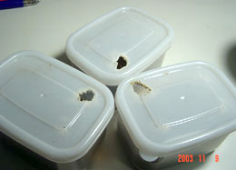 タッパウエアでの♀の管理は危険です。いとも簡単にご覧のような穴を空けてしまい脱走してしまいます。