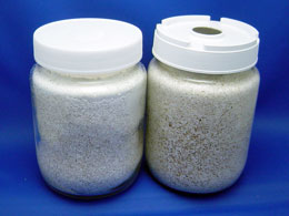 口が狭まっていないため詰め替えや洗浄が大変楽なビンです。♀の場合はこれで羽化させます。難点は、別途タイペストフィルターが必要なことです。1ブロックで大体3~4本ほど詰められます。