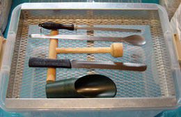 QBOX60サイズで、菌糸ブロック2個の作業が目安です。貴重な時間を有効利用するためにも道具は活用しましょう(特にブロック崩し金網は重宝しています)。
