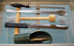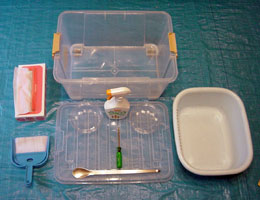 私は決して幼虫を素手で触りませんが(頭幅を計るには触らざるを得ませんが...)、愛用しているのは薬剤師用の大型スプーンと石焼ビビンバ用のスプーン、そして包丁研ぎです。これらをライオンのキレイキレイで消毒してから交換します。