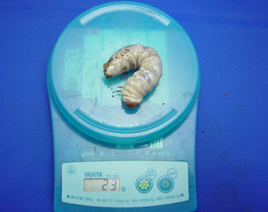 ビンの交換のタイミングにキッチン秤で体重を計測しておきます。前回からの増減を見ることで幼虫の現在の状態を把握することができます。体重測定は、ビン交換時の楽しみの1つでもあります。