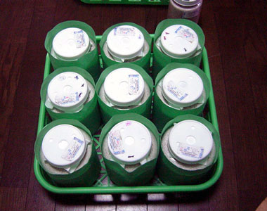 初齢では600ccでも十分との見方(昨年までは私もそうでした)もありますが、初期での生育環境からその後の成長が左右されるとの先輩達の助言もあり、今年からは800ccビンか850ccのポリ容器に投入しています。実は、生育の問題もあるのですが、1本目のビンの後期に差し掛かると幼虫が狭そうにしているのが可哀相というのが本音です。