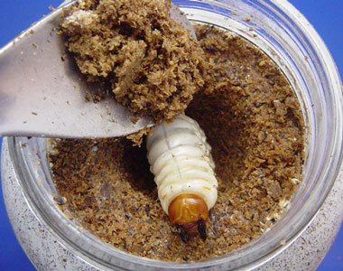 交換時には前の菌糸ビンの食痕や糞を幼虫と一緒に入れてあげることが必要です。