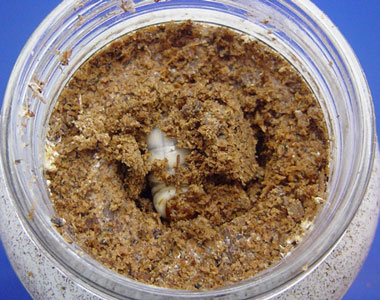 糸ビンの中央にドンと居座って自分の排泄したフンを繰り返し食べているような幼虫には大型のものが多いようです。下記は、G-POT内の三潴産。