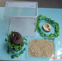 インテリアウッド自体には16gの餌穴が空いていますが、♀はともかく♂には小さすぎるのでペアリングにもしようしている60g+16gの餌皿をセットで使用しています。