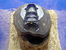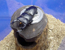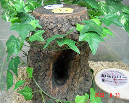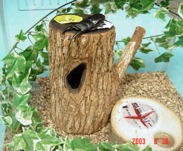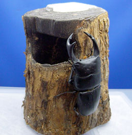オオクワガタのペアが樹洞にはいっても十分暮らせるサイズです。てっぺんに16gゼリー用の穴が2箇所空いています。洞の中は焼きいれ加工がしてあり雰囲気もバッチシです。もっともお気に入りでオオクワの飼育に使用しています。