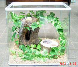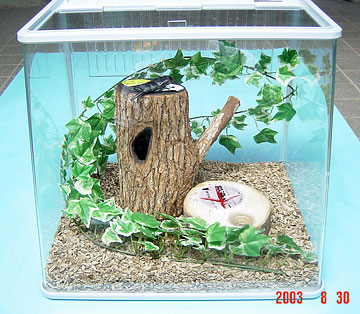 その後は、2階のニッチにご覧のように設置しています。ちょうど子供達の目の高さで観察にはもってこいです。夜間には懐中電灯をヨコに置いてありますので自然観察できるようにしております。