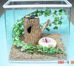 手ごろな水槽でとインテリアウッドやクラフトウッド(要は、クワガタが隠れることができる穴が空いている木)を配置して、観葉植物もどきの人工リーフを巻きつければ、そこはちょっとした林の中です。
